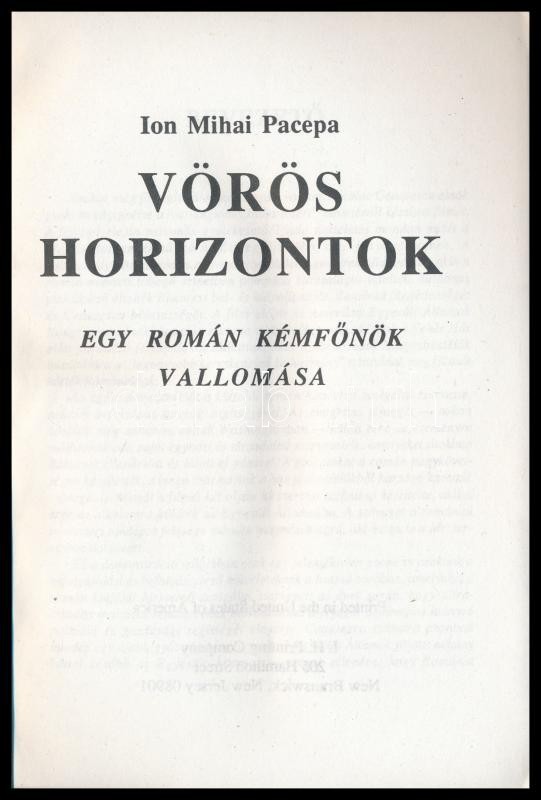Leírás: Pacepa, Ion Mihai: Vörös horizontok. Egy román kémfőnök vallomása. New Jersey, é. n., I. H. Printing Company. Kiadói papírkötésben, jó állapotban.