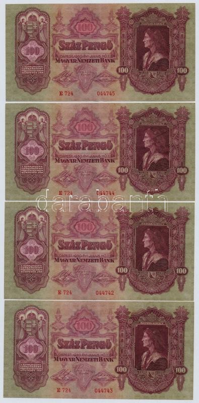 1930. 100P (4x) sorszámkövetők T:II https://www.darabanth.com/hu/311-Gyorsarveres/311.0/Numizmatika/Magyar-bankjegyek~7/1930-100P-4x-sorszamkovetok-TII~II1702763