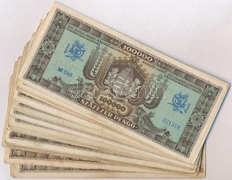 1945. 100.000P (30x) T:III,III- https://www.darabanth.com/hu/311-Gyorsarveres/311.0/Numizmatika/Magyar-bankjegyek~7/1945-100000P-30x-TIII-III-~II1698757