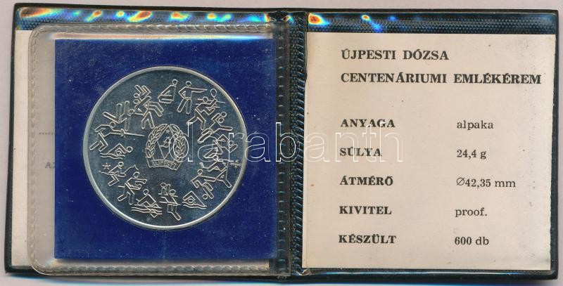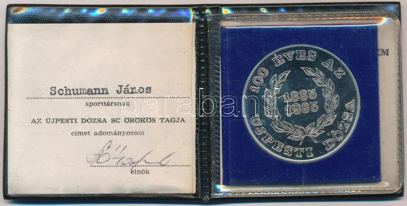 1985. "100 éves az Újpesti Dózsa 1885-1985" alpakka emlékérem eredeti tokban, tanúsítvánnyal, a sportklub akkori elnökének aláírásával (42,35mm) T:1- fo.