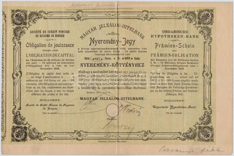 Leírás: Budapest 1913. "Magyar Jelzálog-Hitelbank" nyeremény-jegye, szárazpecséttel T:III