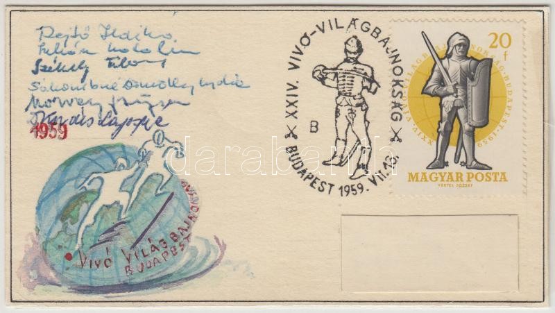 Leírás: 1959 Aranyérmes női tőrcsapat (Sákovicsné Dömölky Lídia, Juhász Katalin, Kovácsné Nyári Magda, Morvay Zsuzsa, Rejtő Ildikó, Székelyné Marvalits Györgyi) aláírásai a XXIV. Vívó-világbajnokság, Budapest emléklapján alkalmi bélyegzéssel
