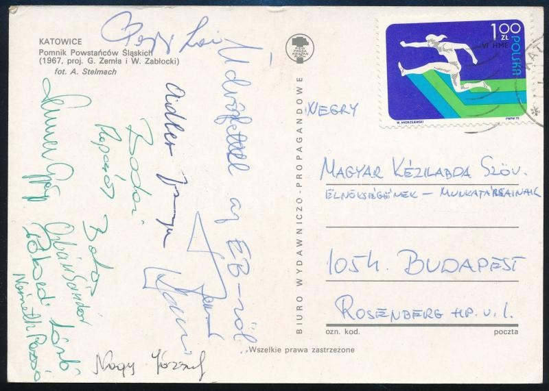 Leírás: 1975 Papp László, Adler Zsigmond és mások aláírásai Krakkóból küldött levelezőlapon