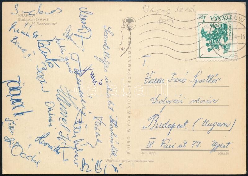 A Vasas Izzó tagjainak aláírásai Krakkóból küldött levelezőlapon https://www.darabanth.com/hu/312-Gyorsarveres/312.0/Festmeny-mutargy-papirregiseg-egyeb/Alairas~18/A-Vasas-Izzo-tagjainak-alairasai-Krakkobol-kuldott-levelezolapon~II1710374