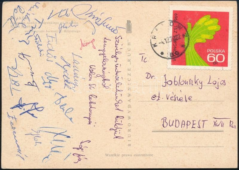 Leírás: A Volán SC tagjainak aláírásai Krakkóból küldött levelezőlapon