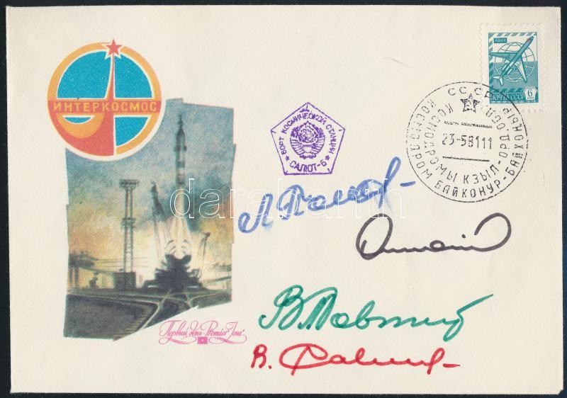 Leonyid Popov (1945- ), Vlagyimir Kovaljonok (1942- ), Viktor Szavinih (1940- ) szovjet és Dumitru Prunariu (1952- ) román űrhajósok aláírásai emlékborítékon / Signatures of Leonid Popov (1945- ), Vladimir Kovalyonok (1942- ), Viktor Savinykh (1940- ) Soviet and Dumitru Prunariu (1952- ) Romanian astronauts on envelope