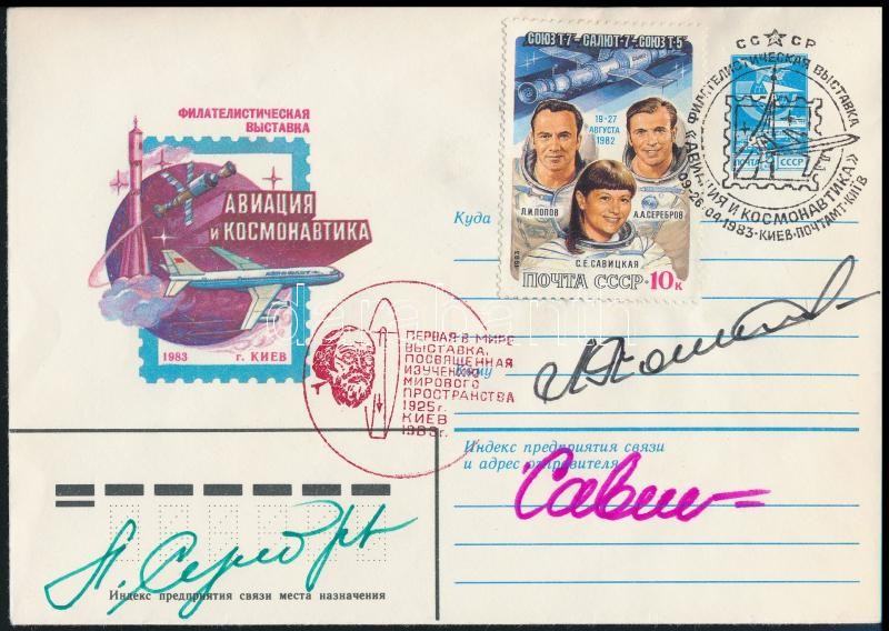 Szvetlana Szavickaja (1948-), Alekszandr Szerebrov (1944-2013) és Leonyid Popov (1945- ) orosz űrhajósok aláírásai emlékborítékon /