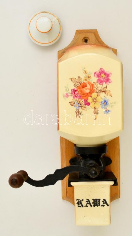 Leírás: Falra szerelhető fajansz elemekből álló kávédaráló, pótolt tetővel, jelzett, h: 33 cm
