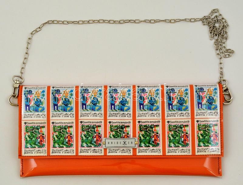 Leírás: Haidekker női dizájn borítéktáska, bélyegekkel díszítve, narancssárga műbőr, jelzett, újszerű állapotban, 29,5x14 cm