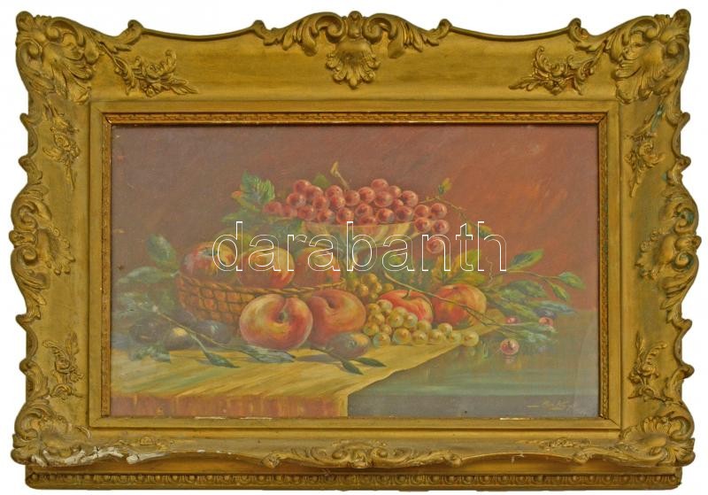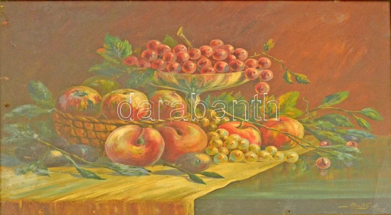 Leírás: Baky Albert (1868-1944): Gyümölcscsendélet. Olaj, karton, üvegezett keretben, 38×42 cm
