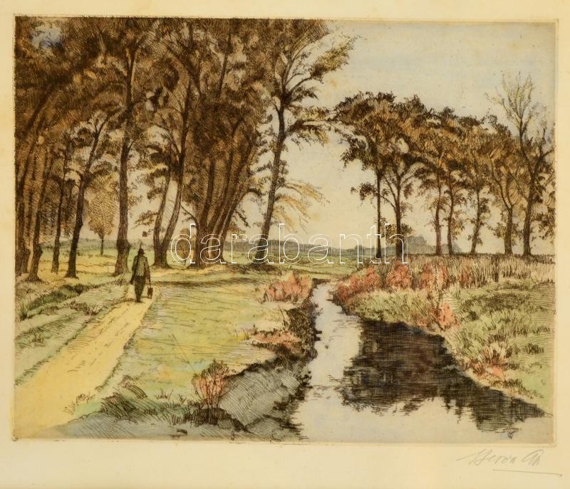 Leírás: Beron Gyula (1885-1971):Táj vadásszal. Színezett rézkarc, papír, jelzett, üvegezett keretben, 29×38 cm