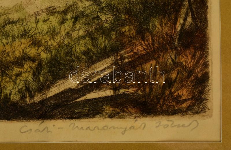 Leírás: Csáki-Maronyák József (1910-2002): Varsahalászok. Színezett rézkarc, papír, jelzett, üvegezett keretben, foltos, 29×37 cm