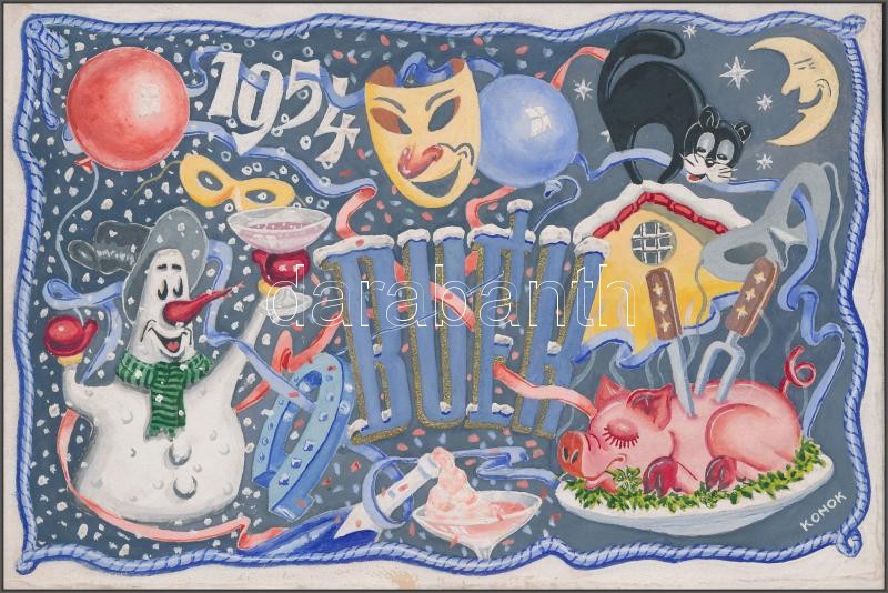 Konok jelzéssel: Buék 1954. Vegyes technika, papír, 10,5×16 cm https://www.darabanth.com/hu/312-Gyorsarveres/312.0/Festmeny-mutargy-papirregiseg-egyeb/Festmenyek-es-grafikak~1/Konok-jelzessel-Buek-1954-Vegyes-technika-papir-10-5C39716-cm~II1689281