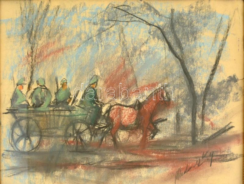 Leírás: Mednyánszky jelzéssel: Vonuló katonák. Pasztell-szén, papír, üvegezett keretben, 29×44 cm