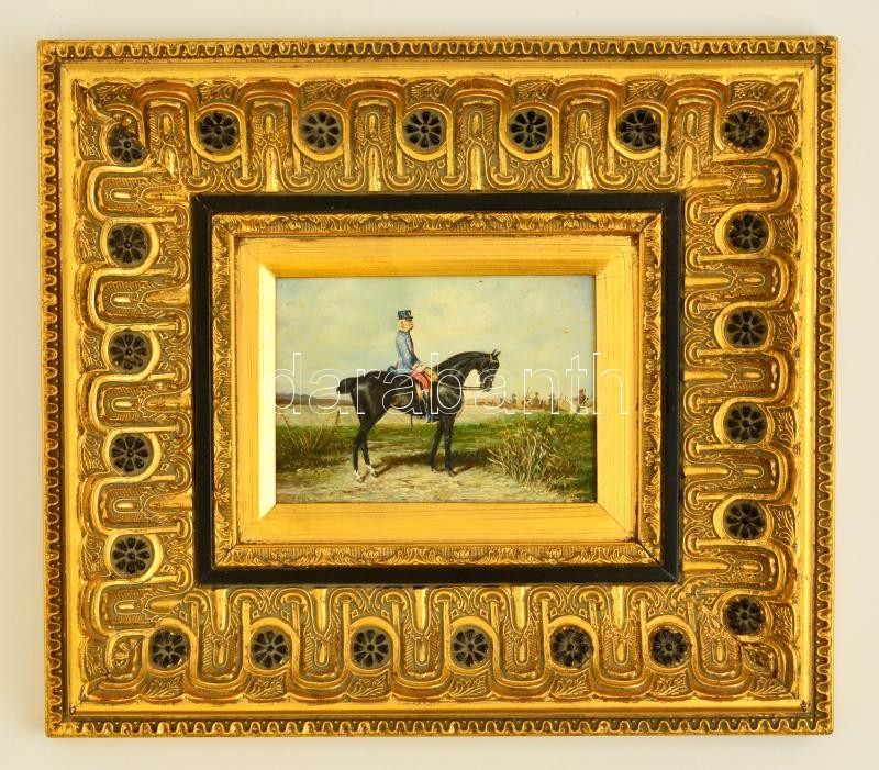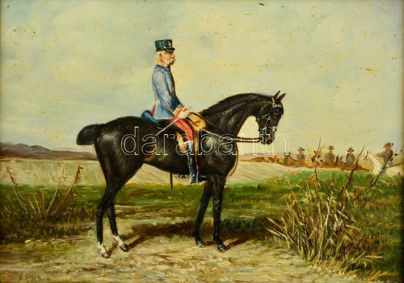 Leírás: Olvashatatlan jelzéssel: Ferenc József a lovon. Olaj, falemez, keretben, 12×18 cm