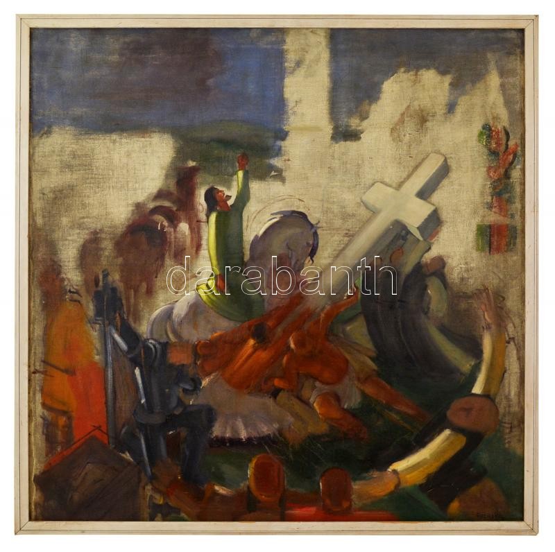 Leírás: Ruzicskay György (1896-1993): Keresztállítás. Olaj, vászon, jelzett, keretben, 100×100 cm