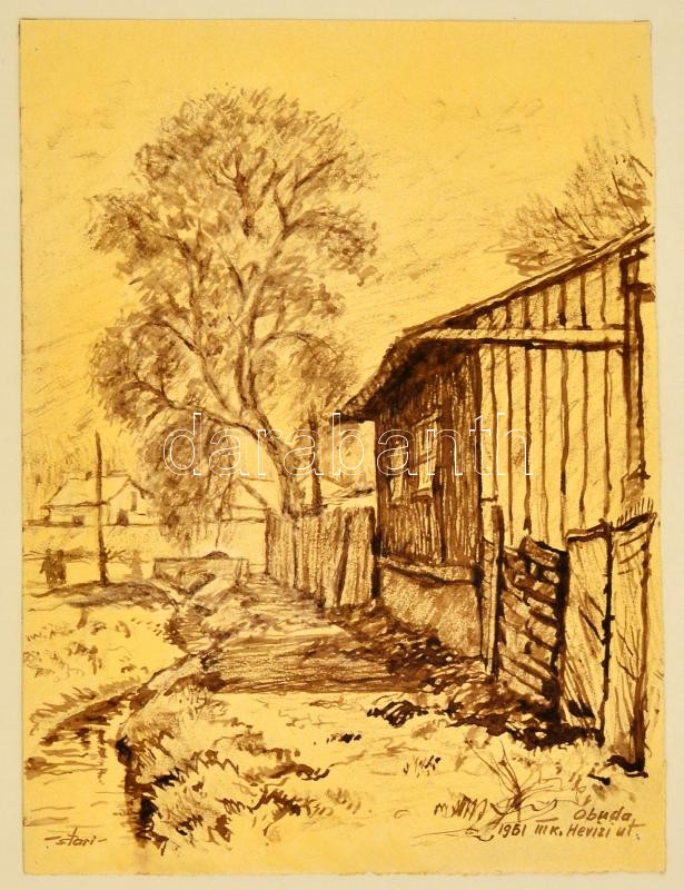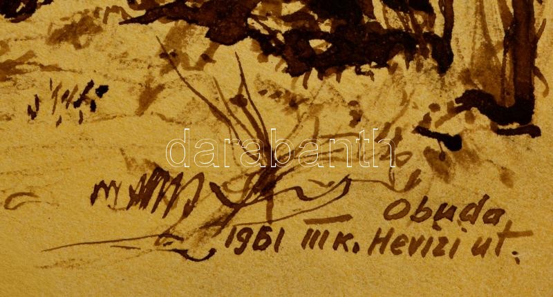 Leírás: Sostarics Lajos (1896-1968): Óbuda Hévízi út. Tus, papír, jelzett, 28×21 cm