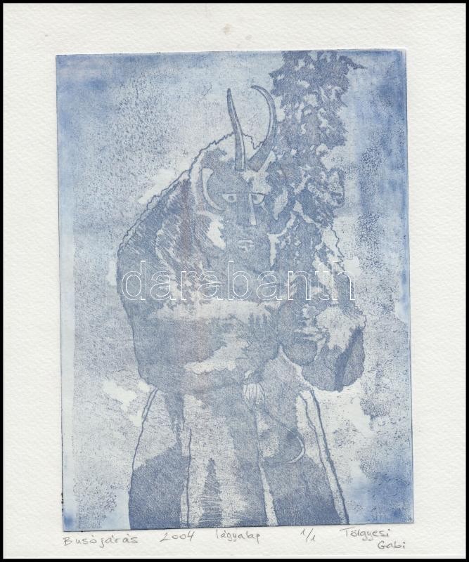 Leírás: Tölgyesi Gabi (?- ): Busójárás, lágyalap, papír, jelzett, számozott (1/1), 19,5×14,5 cm