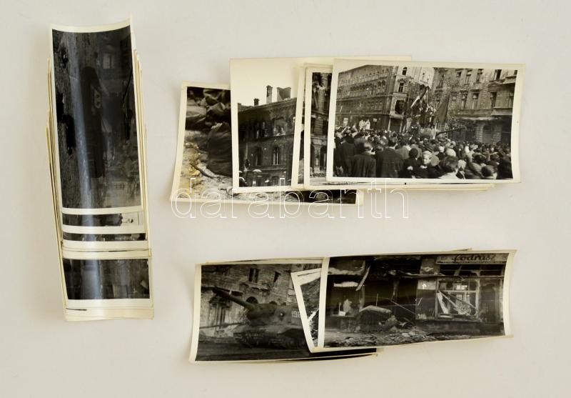 Leírás: 1956 24 db eredeti fotó a forradalmi pesti utcákról, köztük kilőtt tankok, sérült épületek, mozgalmas fotók, 6,5x9,5 cm