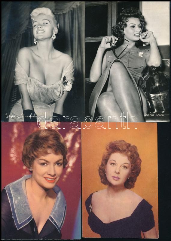Leírás: 5 db színészeket ábrázoló fotólap és képeslap (Sophia Loren, Jayne Mansfield, Susan Hayward, stb.), 14,5x10 cm
