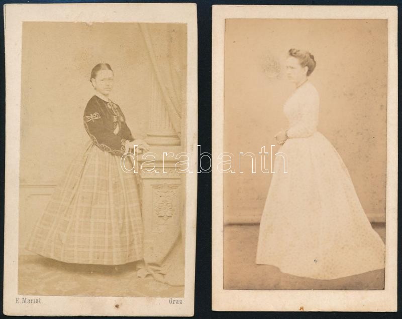 Leírás: cca 1860 Viseletek, 2 db vizitkártya méretű fénykép, 10,5x6,5 cm