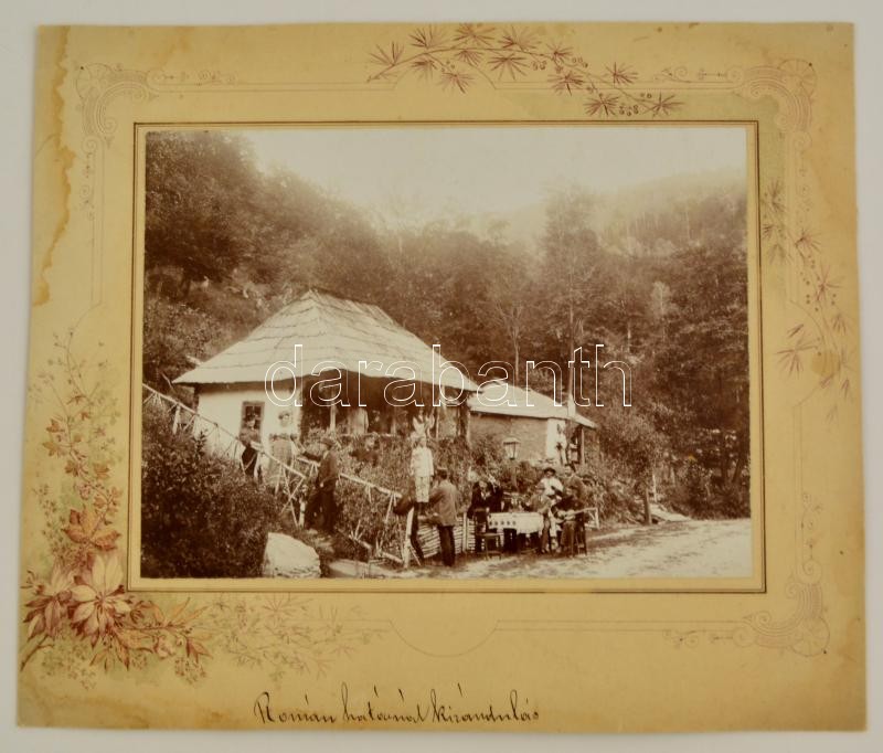 Leírás: cca 1900 Kirándulók a román határnál, díszes kartonra kasírozva, 17x23 cm