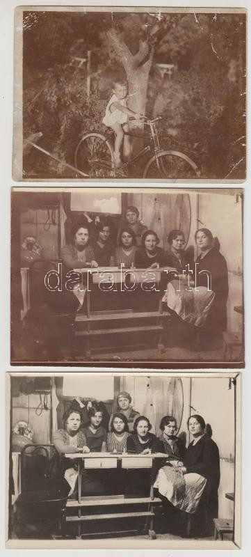 cca 1920 Vegyes fotó tétel, 10 db (régi városképek, kisgyerek biciklin, régi konyhabelsők nőkkel, csoportképek), változó állapotban, az egyik felületén kopásokkal, gyűrődéssel, egy másik sarkain hiánnyal, 9x12 cm és 6x9 cm közötti méretben.