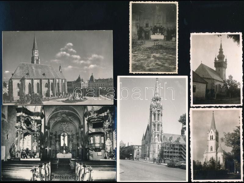 Leírás: cca 1940-1960 Templomok, 6 db fotó ill. fotólap, egy részük hátulján feliratozva, különböző méretben
