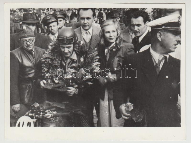 cca 1950 Fergus Anderson (1909-1956) brit motorversenyző győzelme után, hátoldalon feliratozott fotó, 9x12 cm / Fergus Anderson (1909-1956) British professional motorcycle racer