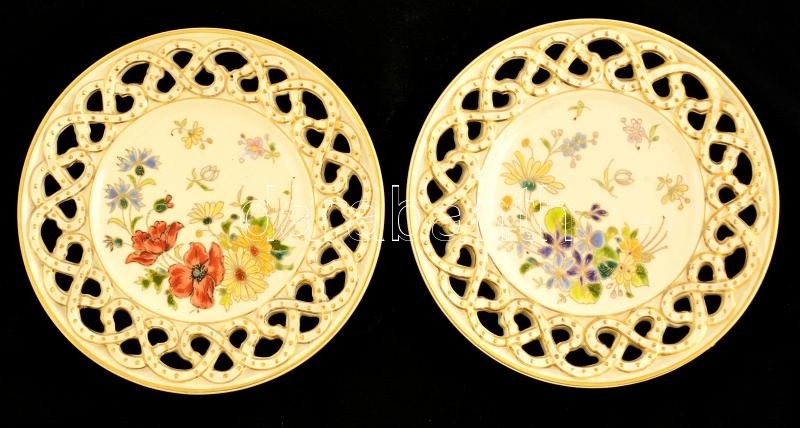 Leírás: 2 db Schütz Cilli áttört dísztányér, kézzel festett, jelzett, kis kopásokkal, d: 19 cm