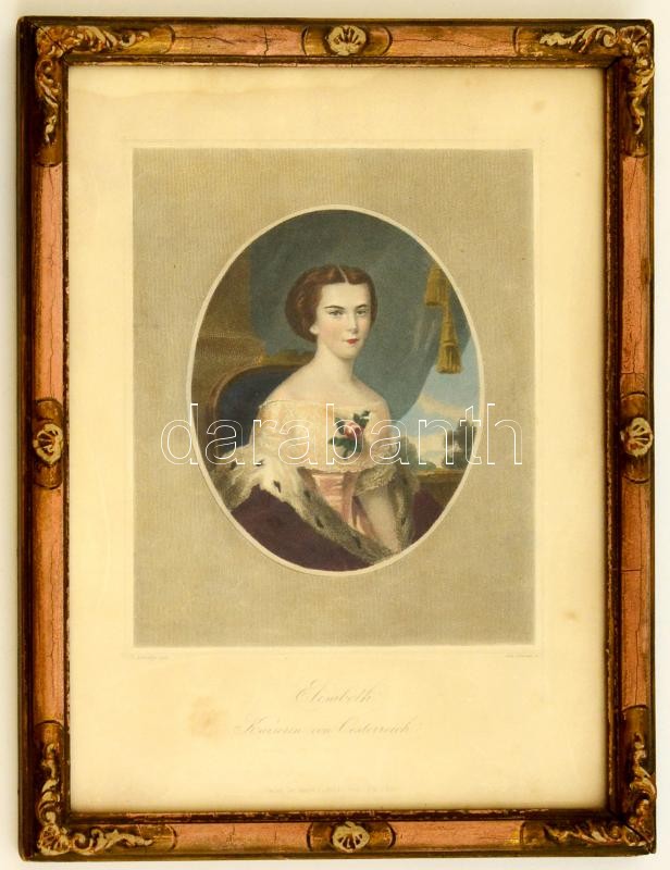 cca 1860 Erzsébet királyné fiatalkori portréja, színezett acélmetszet, papír, Johann Richard Schwager után metszette Joseph Axmann, Verlag der Kunst-Anstalt des Österreichischer Lloyd, üvegezett fa keretben, 16×13 cm