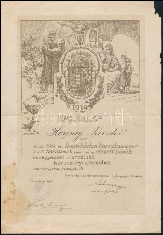 1914 A hadsegélyező hivatal által kiadott személyre szóló emléklap azoknak, akik a honvédelmi harcban elesett hősök özvegyeinek és árváinak karácsonyi öröméhez hozzájárult