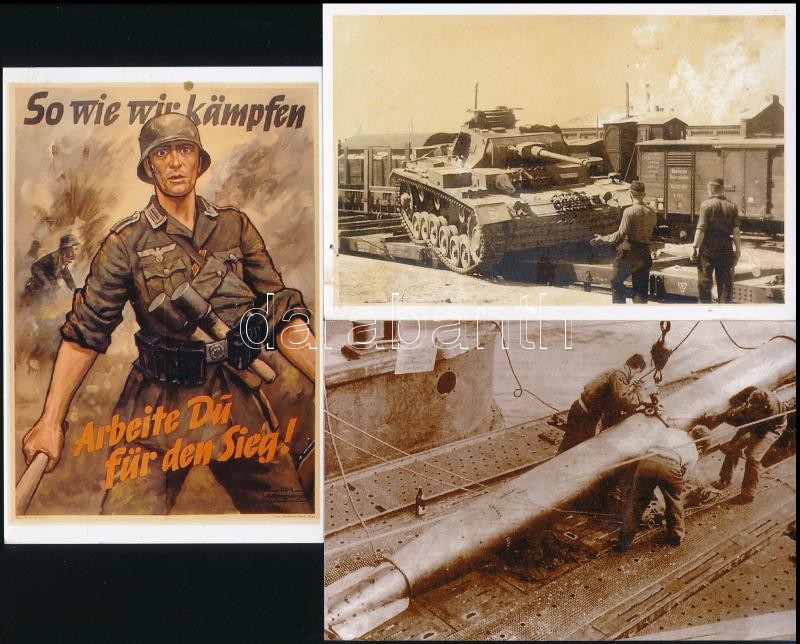 Leírás: 5 db II. világháborús fotó és plakát modern fotómásolata, köztük német tank, torpedó, 10x15 cm