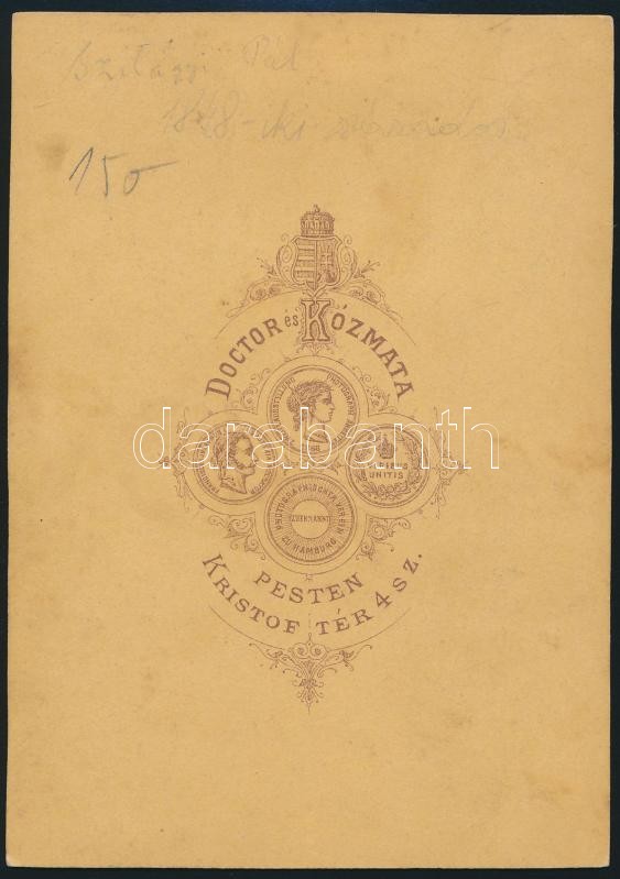 Leírás: cca 1880 Szilágyi Pál (1812-?) 1848-49-es nemzetőr, majd százados a komáromi 18. honvédzászlóaljban, később a tatai honvédegylet elnöke. 10x14 cm