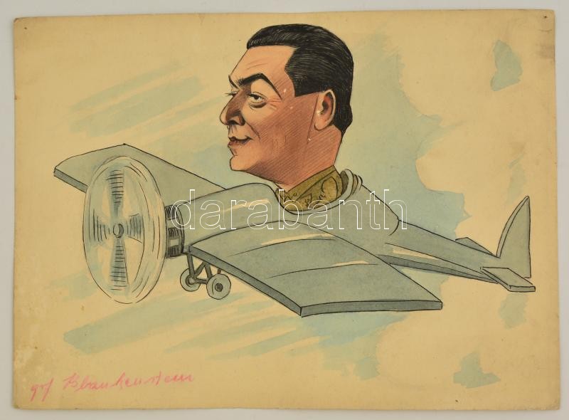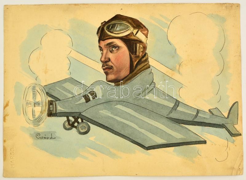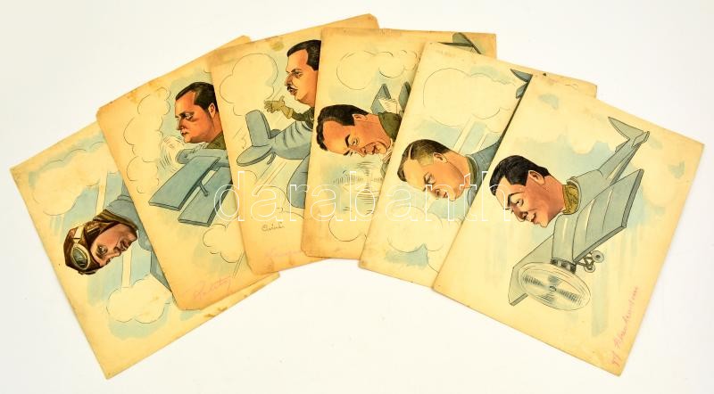 cca 1935 Szép Lajos (1886-?) grafikus, karikaturista 6 db karikatúrája magyar pilótákról, köztük gróf Blankenstein Pál, Várhidy. Akvarell-tus, jelzett, néhány foltos, kis szakadások, 21,5x30 cm