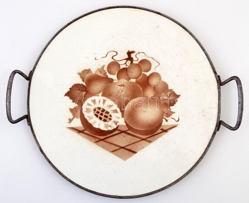 Leírás: Virágmintás fajansz tál, fém kerettel, fogóval, máz alatti repedésekkel, d: 28 cm