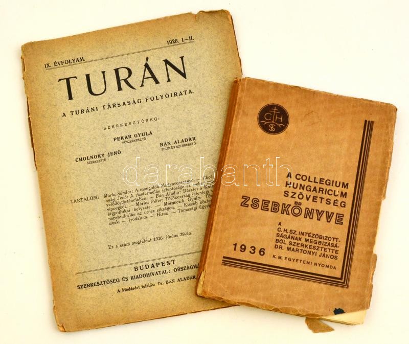 1926-1936 a Turán 9. évf. (1926) 1-2. lapszáma, érdekes írásokkal, sérült papírkötésben + A Collegium Hungaricum Szövetség zsebkönyve 1936, elváló papírkötésben