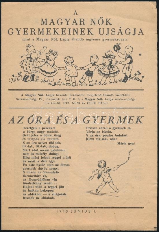 1927-1940 Vegyes nyomtatvány és tankönyv tétel, összesen 4 db: A Magyar nők gyermekeinek újságja 1939 nov. 20. és 1940 június 1. Öveges Kálmán: Vezérkönyv a betűvetés ABC-s könyvhöz. Magyar fiúk nótáskönyve