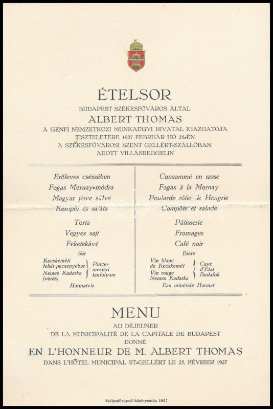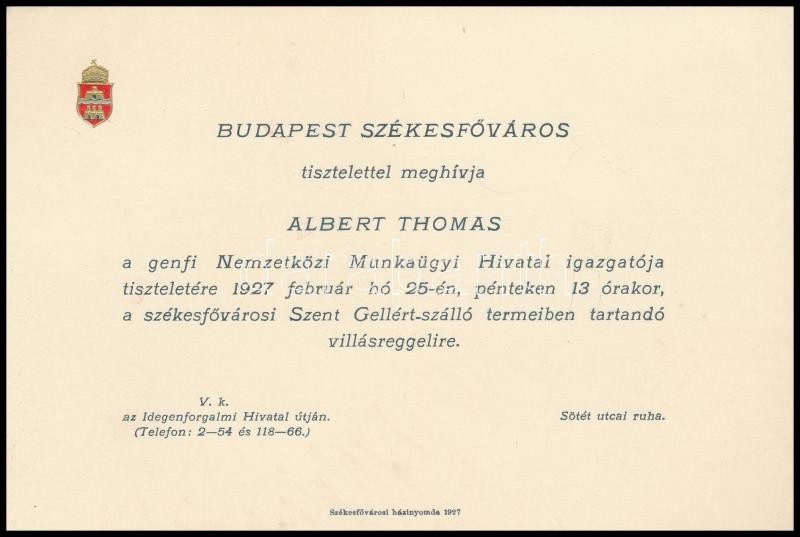 1927 Albert Thomas (1878-1932) a genfi Nemzetközi Munkaügyi Hivatal igazgatójának (1919-1932), francia szocialista politikus, korábbi francia hadügyminiszter, tiszteletére adott villásreggeli meghívója, és menüsora. Bp., Székesfővárosi Házinyomda, a menüsoron hajtásnyommal. /