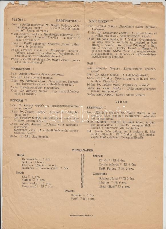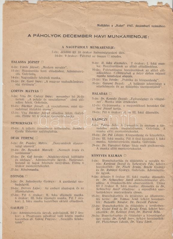 Leírás: 1947 Szabadkőműves Páholyok 1947. december havi munkarendje, Kelet 1947. decemberi számának melléklete, Bp. Márkus-ny., szakadozott állapotban.