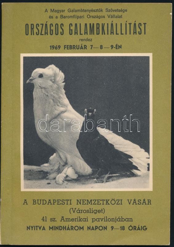 1969 Országos galambkiállÃtás. Budapest, 1969. február 7-9. Rendezi: Magyar GalambtenyésztÅ‘k Szövetsége. Bp., FÅ‘városi Nyomdaipari Vállalat. Kiadói papÃrkötés, 41+1 p. Kiadták 2000 példányban.