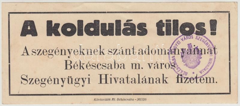 Leírás: cca 1910-1930 "A koldulás tilos!", aprónyomtatvány Békéscsaba Szegényügyi Hivatalának bélyegzőjével