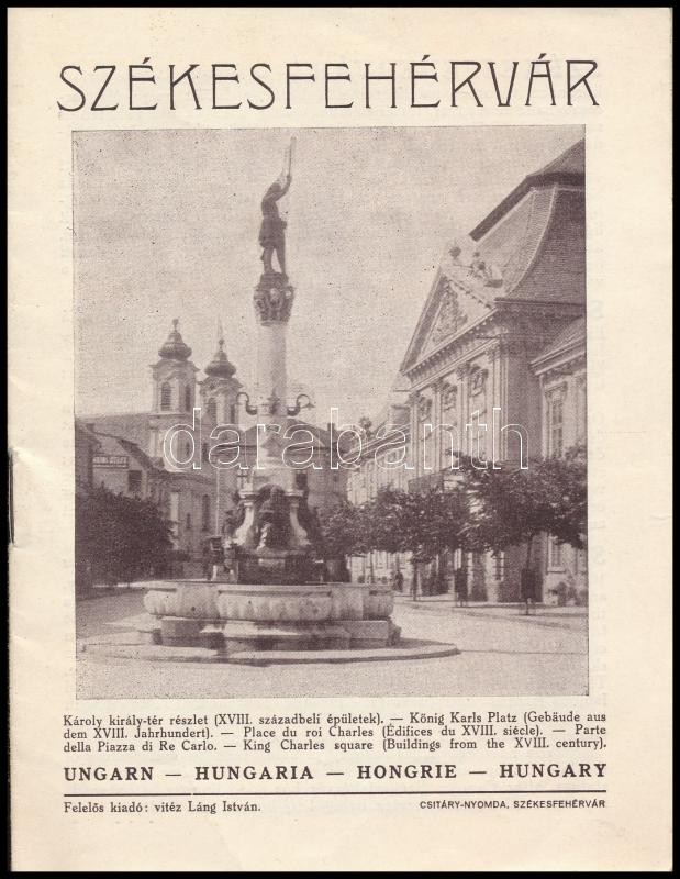 Leírás: cca 1930-1940 Székesfehérvár utazási prospektus, fekete-fehér fotókkal, magyar, angol, francia, német és olasz nyelven. Bp., Csitáry-Nyomda, 16 p.