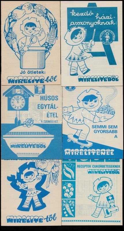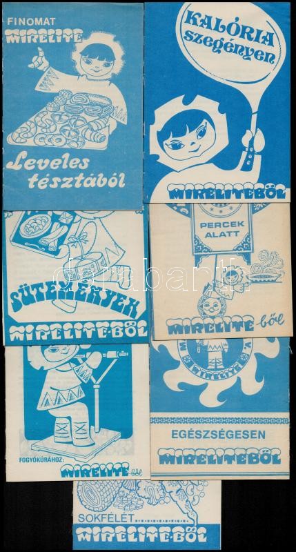 Leírás: cca 1980 Mirelite reklám nyomtatványok, 13 db, (pl.: sütemények mireliteből, kalória szegényen mireliteből, receptek cukorbetegeknek mireliteből...stb.)