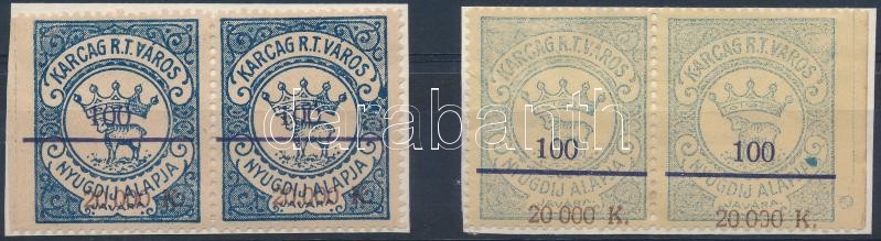 Leírás: 1925 Karcag R.T.V. okirati 2 klf illetékbélyeg ívsarki párokban (2.600)