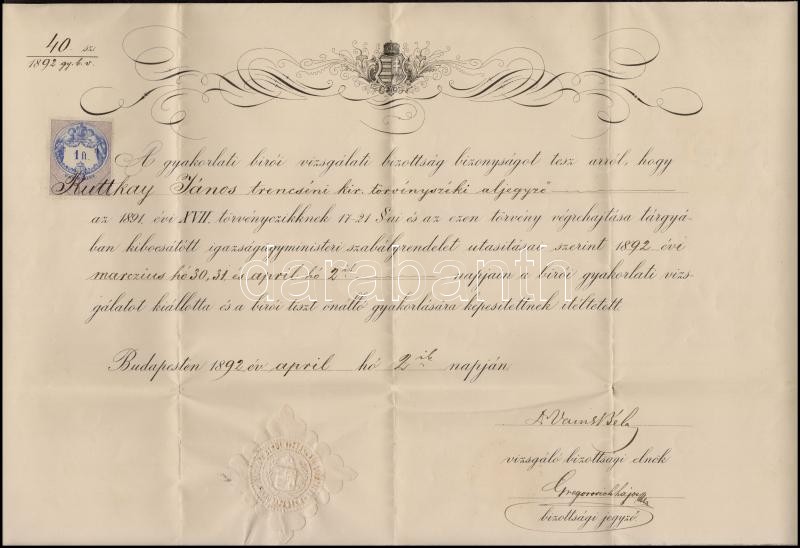 Leírás: 1892 Bírói vizsga bizonyítvány. 1Fl okmánybélyeggel