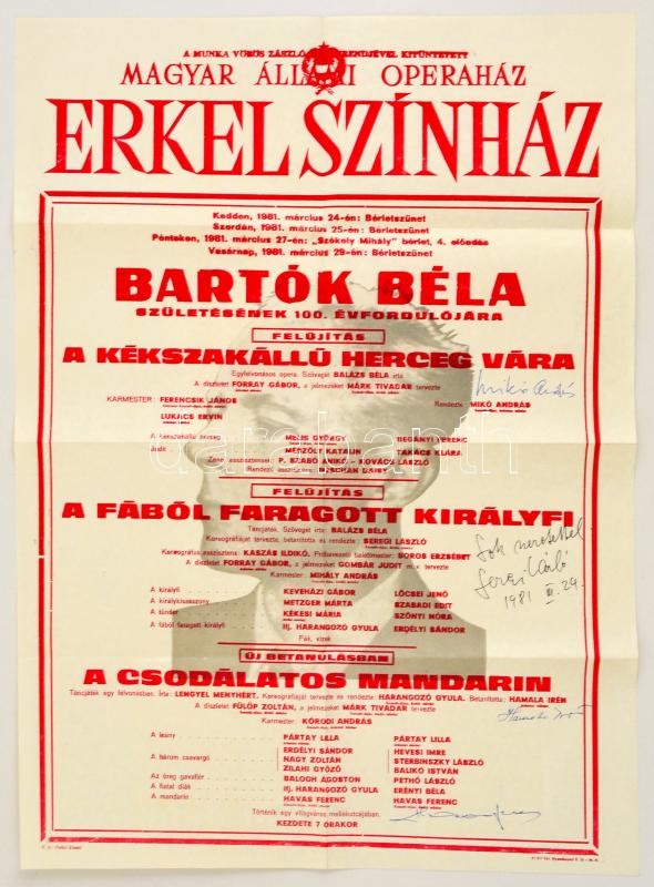 1981 AZ Erkel Színház Bartók Béla születésének 100. évfordulójára rendezett előadásának plakátja, a rendező Mikó András, Hamala Irén, Havas Ferenc, Seregi László művészek aláírásaival, hajtott, 70x50 cm