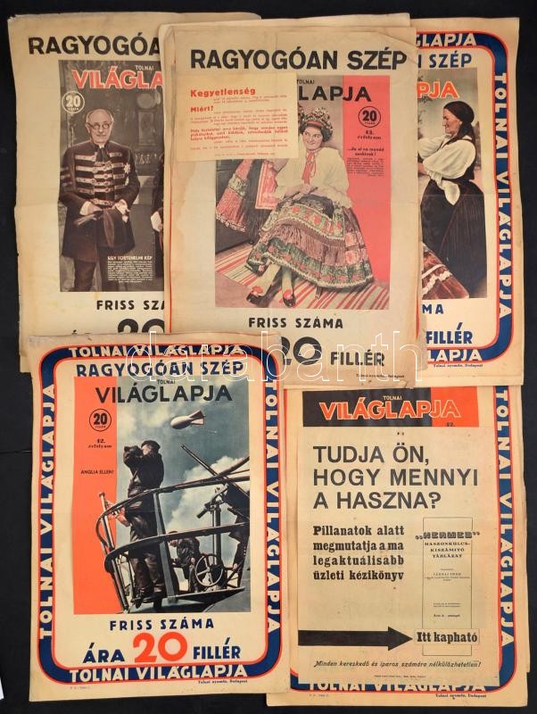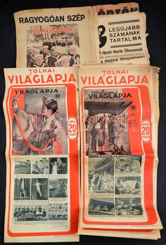 cca 1930 Óriási újságplakát gyűjtemény. Az újságosbódékra kiragasztott, nagyrészt a Tolnai Világlapja különbözÅ‘ számait reklámozó, de ezen kÃvül Délibáb, Ünnep és Moziélet újságokat is reklámozó plakátok. Majdnem mind különbözÅ‘. Történelmi események, kiemelkedÅ‘ alakok a cÃmlapokon. Összesen 76 db 30x50 cm