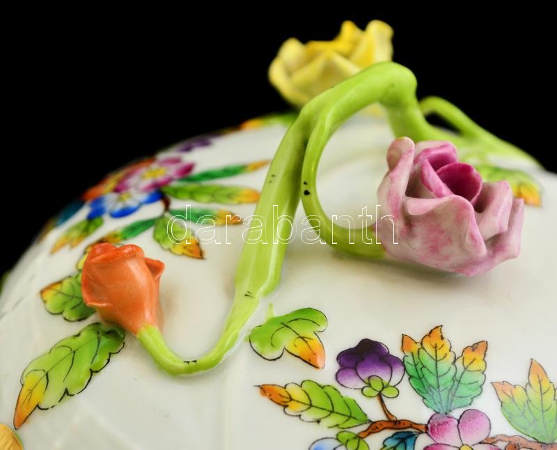 Leírás: Herendi Viktória mintás rózsás bonbonier, kézzel festett, jelzett, hibátlan, eredeti sérült dobozában, 12x13x11 cm