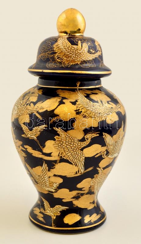 Leírás: Madaras fedeles váza, kézzel festett, kopott, jelzés nélkül, m: 26 cm